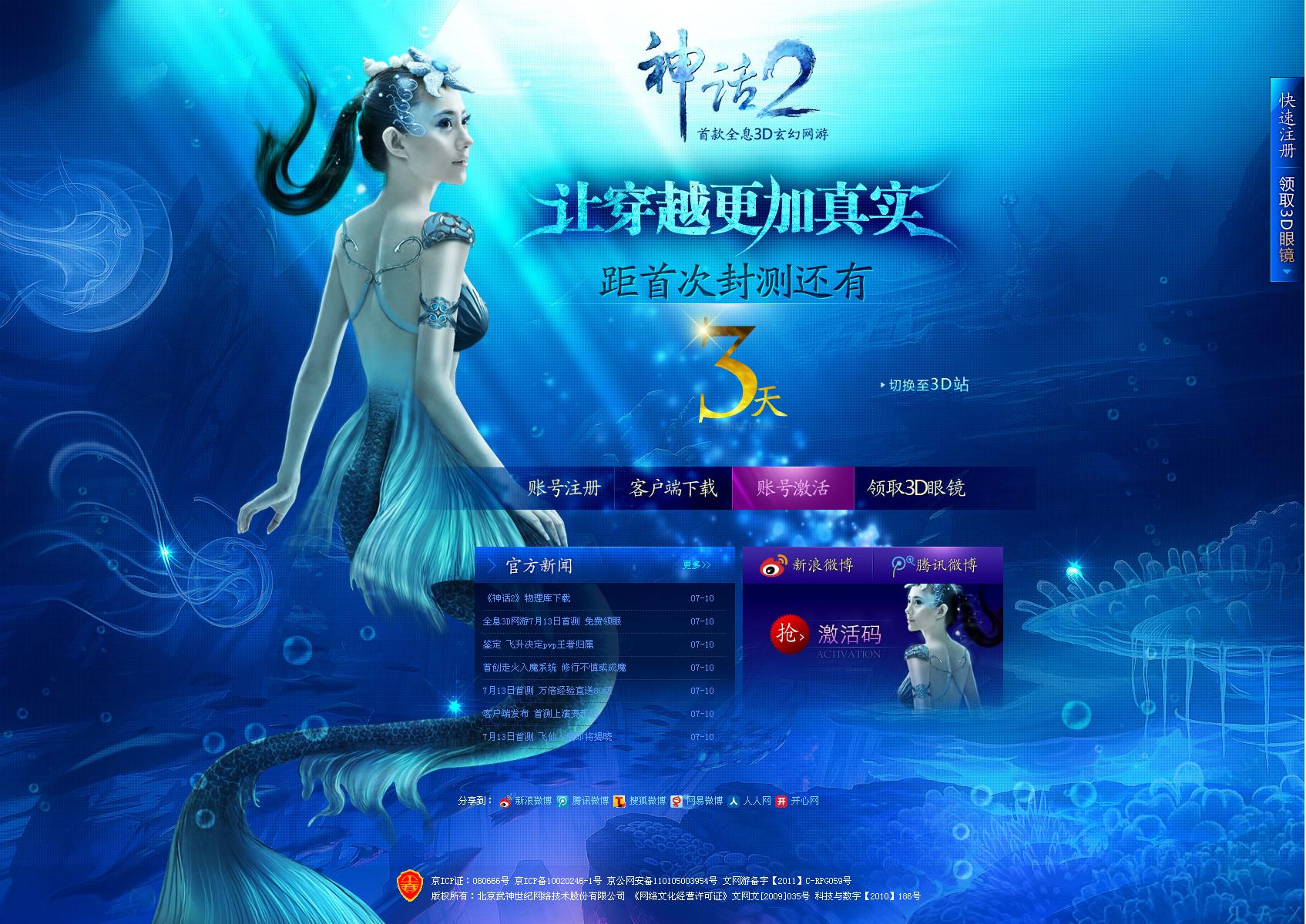 《神话》官网首测倒计时 可切换为3D立体模式佩戴眼镜观看