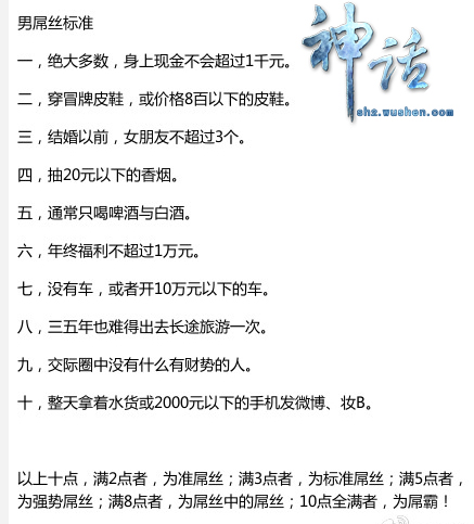 时间:2012年11月21日如今流行新屌丝标准了,身上的现金不会超过1千,结婚之前女友少于3个,抽低于20块钱的烟,经常喝啤酒与白酒,穿冒牌皮鞋或者皮鞋少于800百元,没车或者开10万元以下的车,年终福利不超过1万元,交际圈没什么有财势的人,整天拿着水货或者2000以下的手机发微博,三五年也难得出去旅游一次。亲爱的《神话》亲们,你们被屌丝了吗?被发好人卡了吗?