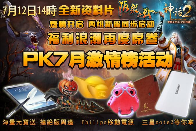 7月12日14:00—7月22日24点,新资料片阪泉之战两组新服阪泉之战、炎黄争霸分别开启角色等级排名活动,新创建角色等级排名前100名者,将获得不等数额的元宝,实物大奖、限量周边。两组新服排名前30者可参与实物大奖的抽取:三星note2,共1台;前31名至60名,参与Philips移动电源抽奖,共 2台;对应的排名都将获得限量周边如:高级羊皮笔记本、河马宠物、十字绣、特质信封、红蓝眼镜等。