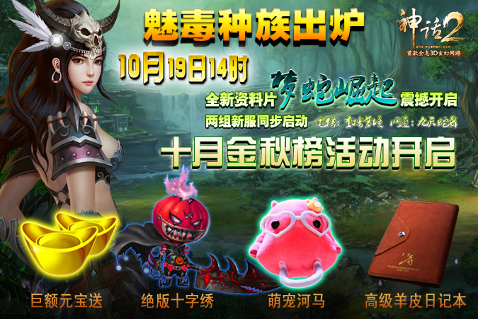 为迎接10月19日全新资料片梦蛇崛起,两组电信:重楼梦境 网通:九天蛇舞的开启,十月金秋榜活动开启,为英雄呐喊!10月19日14:00—10月27日24点,新服重楼梦境、九天蛇舞分别开启角色等级排名活动,新创建角色等级排名前100名者,将获得不等数额的元宝,限量周边。高级羊皮笔记本、河马宠物、十字绣、特质信封、红蓝眼镜等。