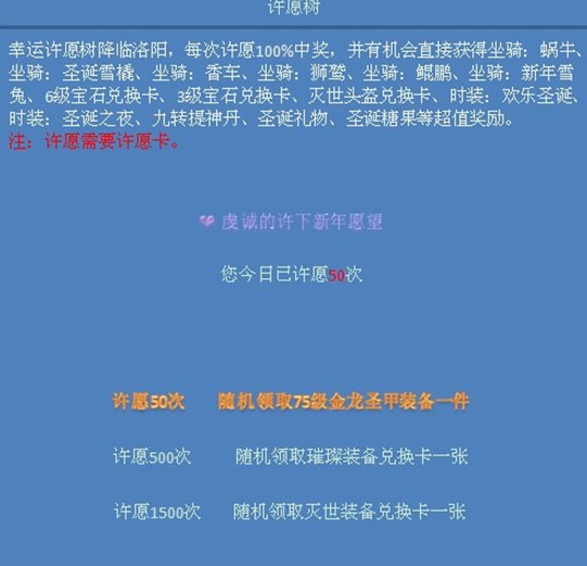 为了答谢广大玩家一致的关注与厚爱,幸运许愿树降临洛阳,开启100%中奖,并有机会直接获得极品装备、道具等超值奖励。2012年12月21日起至1月 10日;全区全服在洛阳的许愿树上,每消耗一个心愿卡便可以在许愿树处进行一次许愿,许愿卡可以在商城购买,将可以获得海量经验值、宝石、动感时装、宝石 精华、炫酷坐骑、极品宠物,宠物技能书等奖励。活动期间每天开启许愿树,开启50次,可以获得“75级金龙圣甲装备随机一个”;开启500次,可以获得“璀璨装备随机一个”开启1500次,可以获得“灭世装备随机一个”。