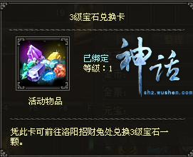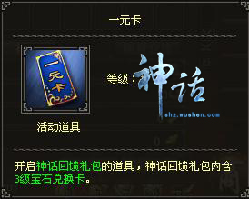 《神话》一元大回馈:2012年12月21日至12月26日24时,神话所有玩家均可前往洛阳领取一元超值“神话回馈礼包”,使用一元卡开启后可获得3级宝石兑换卡一张。每个玩家限领一个,预领从速哦!