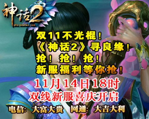 更多劲爆活动,请锁定11月14日18时,《神话2》两组新服激情引爆金秋,新服电信:“大富大贵”、网通:“大吉大利”静候各位小伙伴儿们的组团加入!百万元宝让你拿到手软,赶紧来吧!