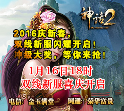 更多劲爆活动,请锁定1月16日18时,《神话2》两组新服激情引爆新春,新服电信:“金玉满堂”、网通:“荣华富贵”静候各位小伙伴儿们的组团加入!百万元宝让你拿到手软,赶紧来吧!